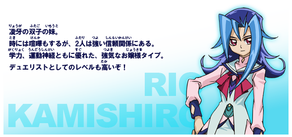 | 当前 | 2015年10月14日 (三) 23:48 | ![]() | 589 × 277(139 KB) | Hamon002 | 分类:神代璃绪源地址:http://www.tv-tokyo.co.jp/anime/yugioh-zexal/chara/index.html |