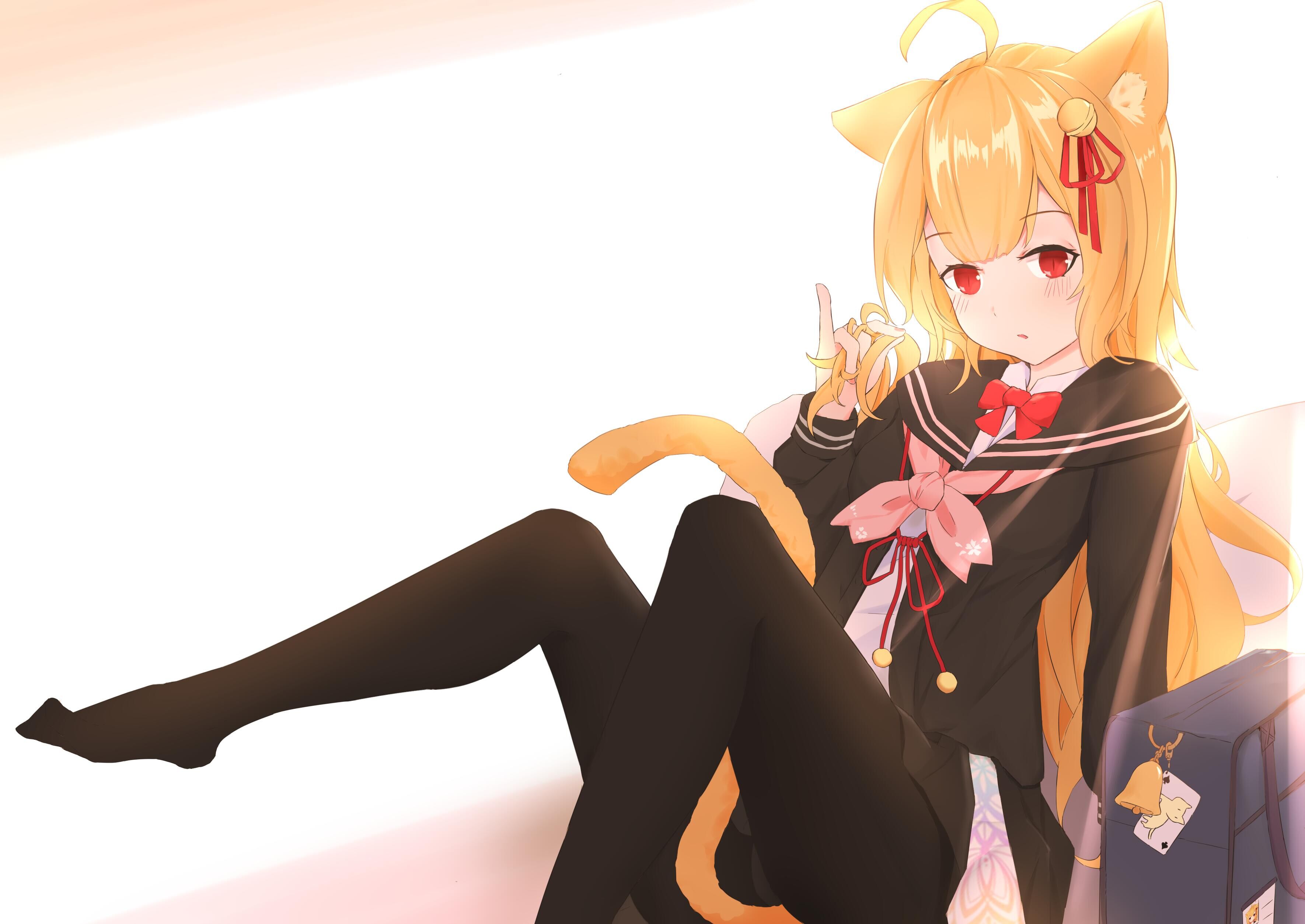 来自异世界的猫娘少女,身着黑色JK制服和黑丝。 黄色头发、头上有一枚铃铛。