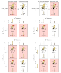 孟德尔用纯种高茎豌豆和纯种矮茎豌豆用作亲本(Parent)进行杂交(Cross),发现无论是正交还是反交(Reciprocal cross),子一代(F1 hybrid[79])总是高茎的。而在子二代中则同时出现了两种性状。
